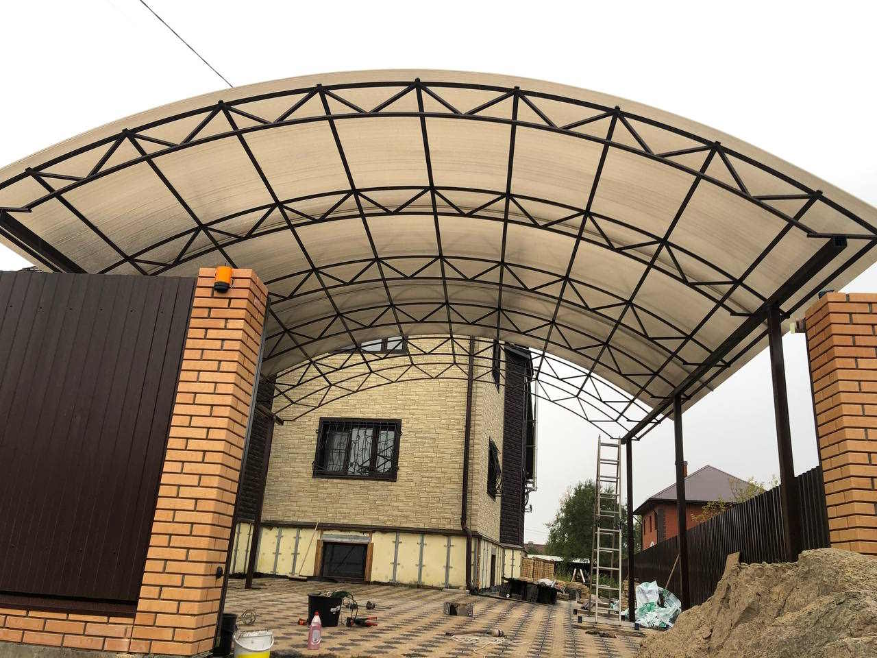 За день на даче изготовили арочный навес 5 на 7 с покрытием поликарбоната. Привезли уже готовые крашенные фермы и весь остальной материал. Все за собой убрали и увезли мусор. Молодцы!